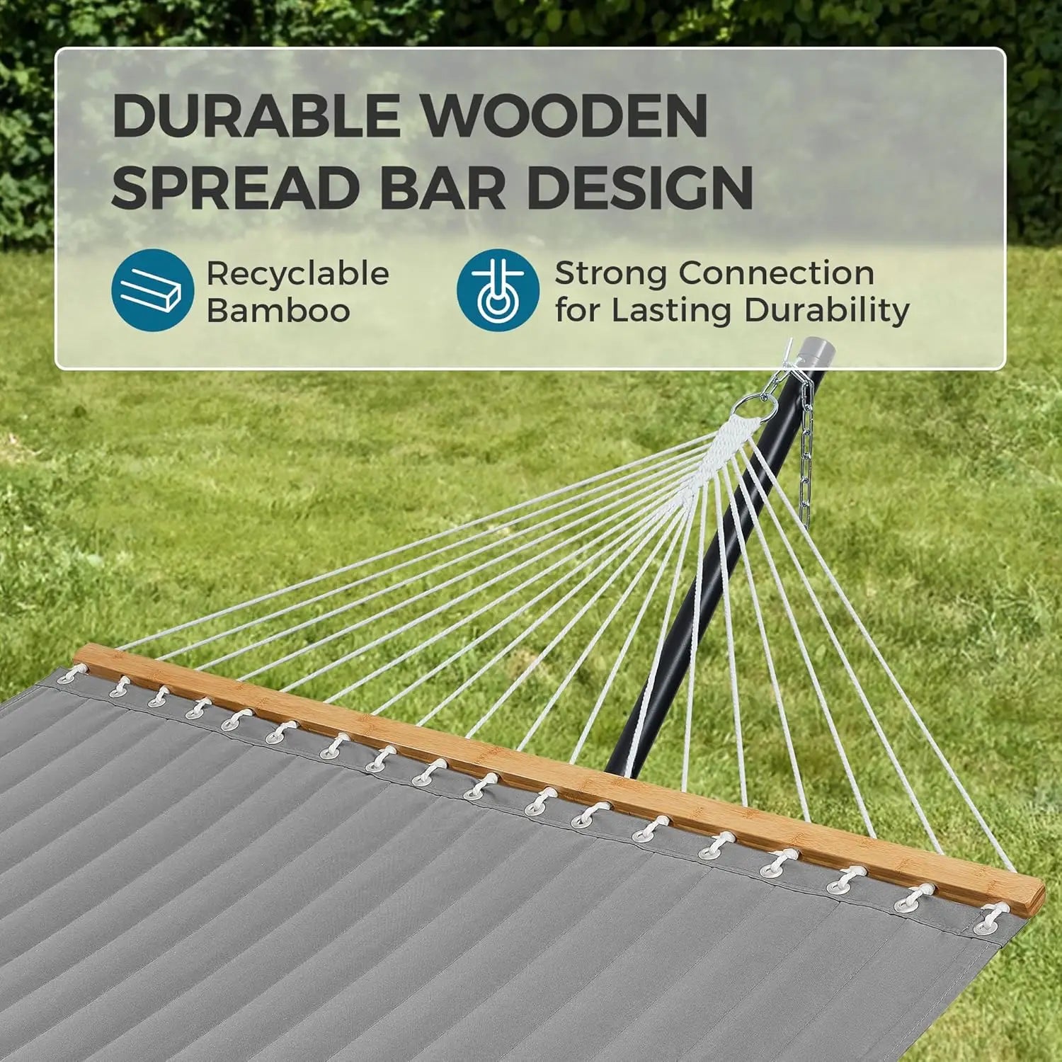 - 2-Person Outdoor Comfort: Sink into relaxation with our 12FT polyester fabric quilted hammock, coming with a detachable soft pillow for soft head support. Designed to hold 2 people, this outdoor hammock with stand offers a wide surface, perfect for lazy summer afternoons. And with adjustable chains, you're in control of your comfort heights